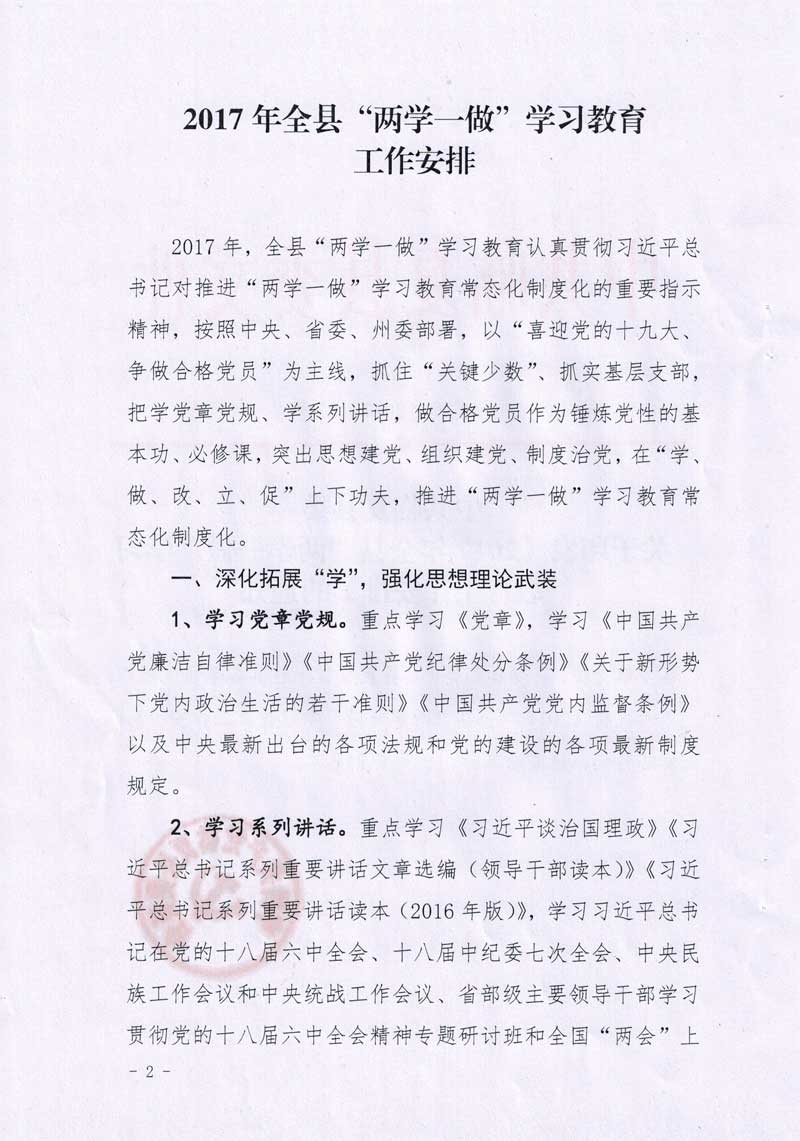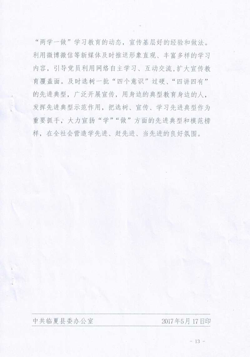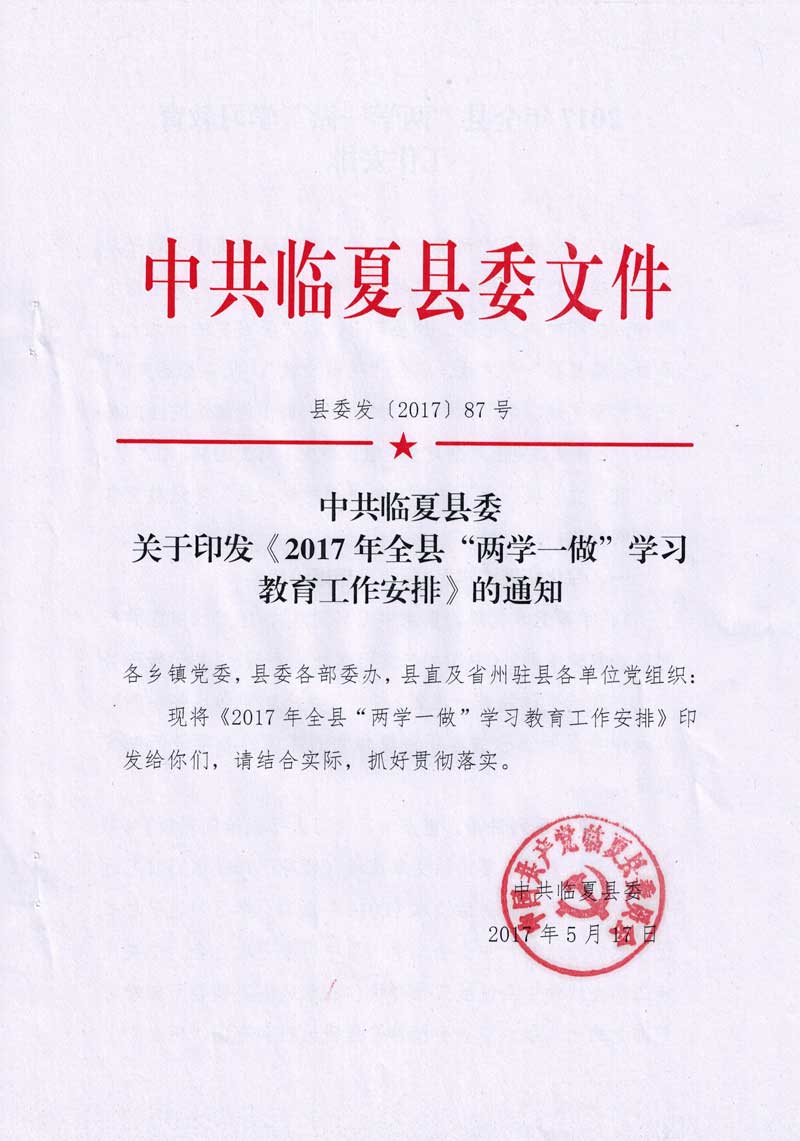 中共临夏县委关于印发《2017年全县“两学一做”学习教育工作安排》的通知